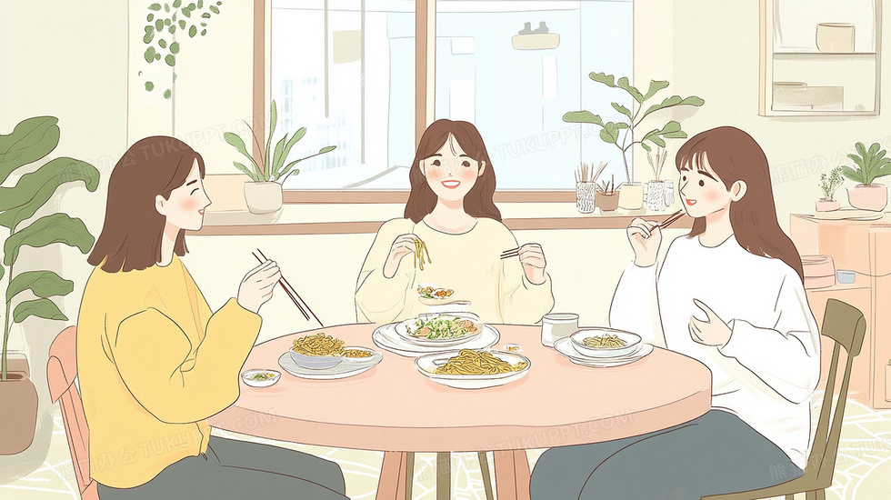 本作品内容为餐馆闺蜜聚会吃饭餐饮美食插画, 格式为 jpg, 大小3 MB, 图片尺寸为2912 x 1632, 源文件无水印, 欢迎使用熊猫办公。 如认为平台内容涉嫌侵权,可通过邮件:tousu@tukuppt.com提出书面通知,我们将及时处理。