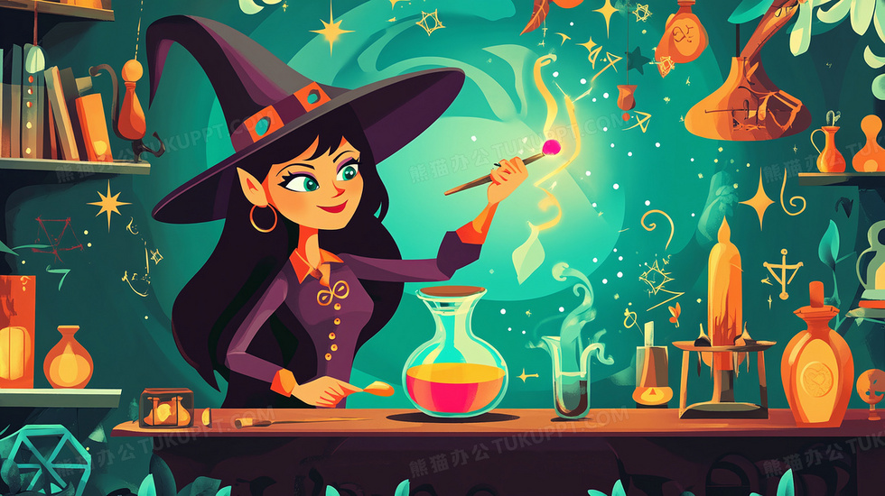 本作品内容为研制魔法药水的魔女插画, 格式为 jpg, 大小5 MB, 图片尺寸为2912 x 1632, 源文件无水印, 欢迎使用熊猫办公。 如认为平台内容涉嫌侵权,可通过邮件:tousu@tukuppt.com提出书面通知,我们将及时处理。