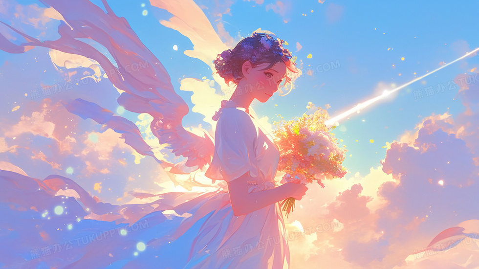 本作品内容为阳光照射手拿花束卡通女孩插画, 格式为 jpg, 大小2 MB, 图片尺寸为2912 x 1632, 源文件无水印, 欢迎使用熊猫办公。 如认为平台内容涉嫌侵权,可通过邮件:tousu@tukuppt.com提出书面通知,我们将及时处理。