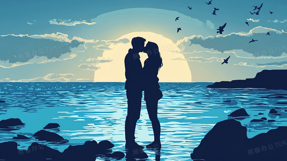 本作品内容为剪影风日出日落海边亲吻的情侣插画, 格式为 jpg, 大小3 MB, 图片尺寸为2912 x 1632, 源文件无水印, 欢迎使用熊猫办公。 如认为平台内容涉嫌侵权,可通过邮件:tousu@tukuppt.com提出书面通知,我们将及时处理。