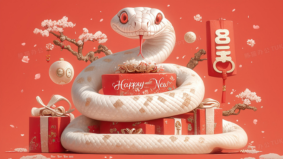本作品内容为2025蛇年新年礼物插画, 格式为 jpg, 大小3 MB, 图片尺寸为2912 x 1632, 源文件无水印, 欢迎使用熊猫办公。 如认为平台内容涉嫌侵权,可通过邮件:tousu@tukuppt.com提出书面通知,我们将及时处理。