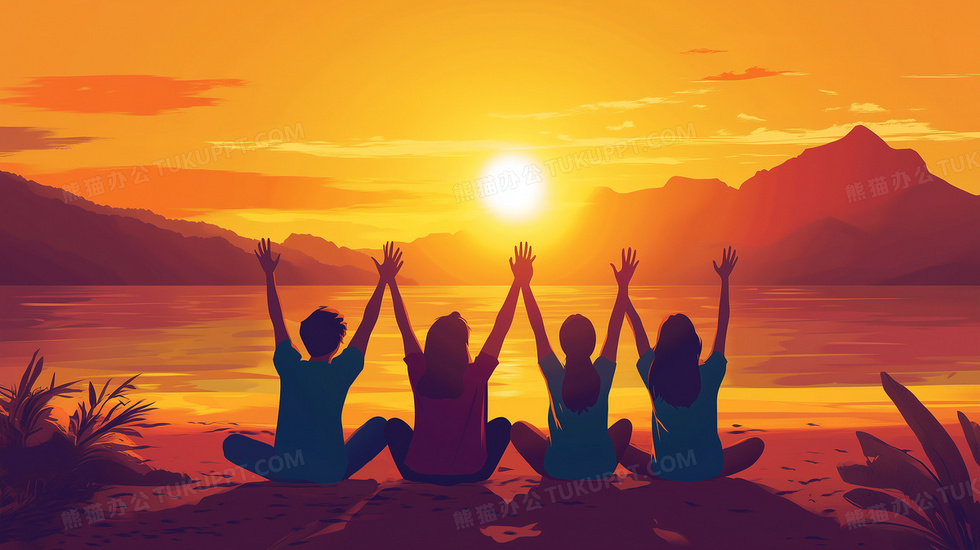 本作品内容为四个年轻人坐在沙滩上举手欢呼插画, 格式为 jpg, 大小7 MB, 图片尺寸为2912 x 1632, 源文件无水印, 欢迎使用熊猫办公。 如认为平台内容涉嫌侵权,可通过邮件:tousu@tukuppt.com提出书面通知,我们将及时处理。