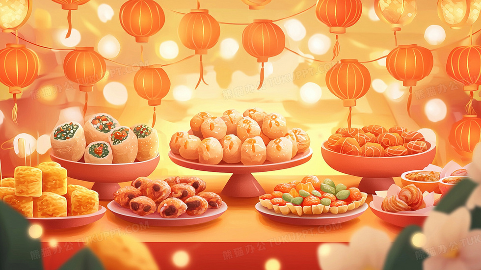 本作品内容为新年春节糕点美食灯笼插画, 格式为 jpg, 大小3 MB, 图片尺寸为2912 x 1632, 源文件无水印, 欢迎使用熊猫办公。 如认为平台内容涉嫌侵权,可通过邮件:tousu@tukuppt.com提出书面通知,我们将及时处理。