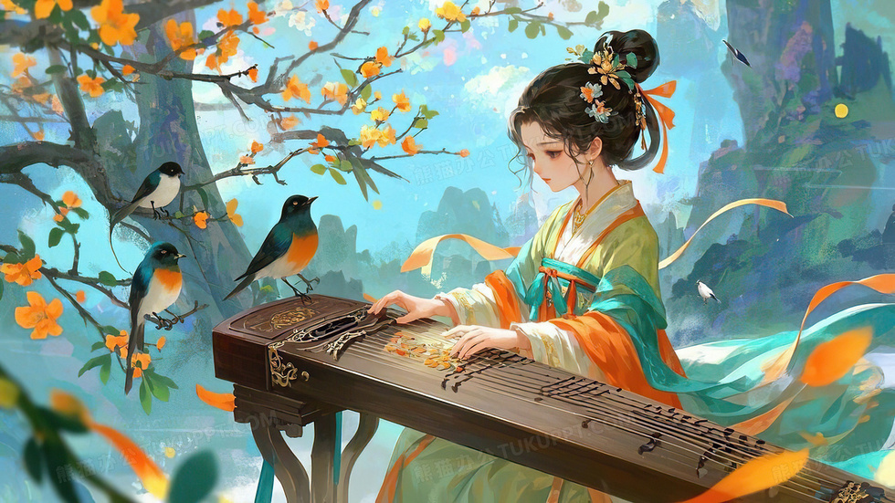 本作品内容为女孩谈古琴琴棋书画传统文化插画, 格式为 jpg, 大小5 MB, 图片尺寸为3072 x 1728, 源文件无水印, 欢迎使用熊猫办公。 如认为平台内容涉嫌侵权,可通过邮件:tousu@tukuppt.com提出书面通知,我们将及时处理。
