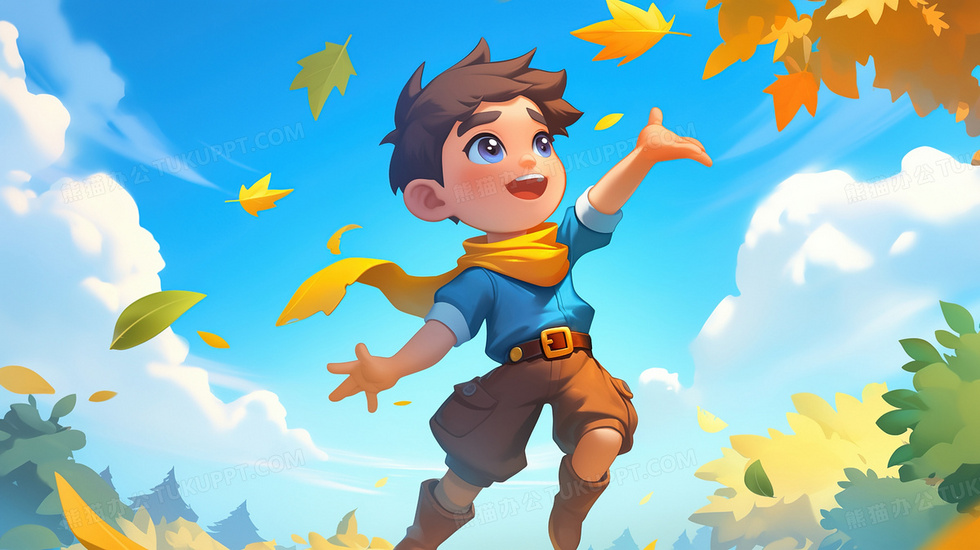 本作品内容为蓝天白云大自然飘落树叶卡通少年插画, 格式为 jpg, 大小2 MB, 图片尺寸为2912 x 1632, 源文件无水印, 欢迎使用熊猫办公。 如认为平台内容涉嫌侵权,可通过邮件:tousu@tukuppt.com提出书面通知,我们将及时处理。