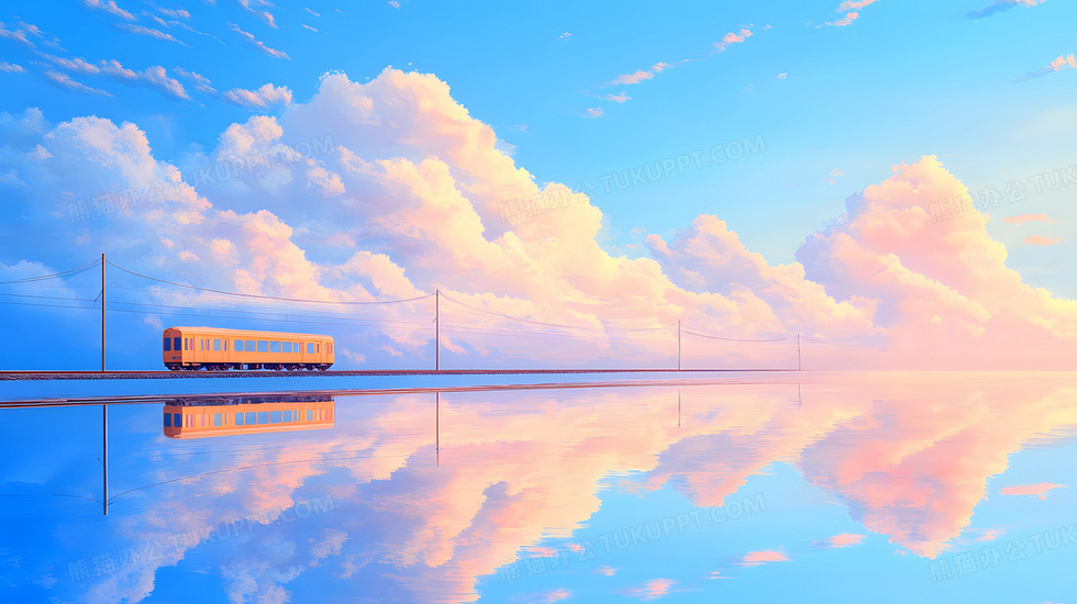 本作品内容为插画风格唯美清新蓝天白云湖面倒影电车, 格式为 jpg, 大小2 MB, 图片尺寸为2912 x 1632, 源文件无水印, 欢迎使用熊猫办公。 如认为平台内容涉嫌侵权,可通过邮件:tousu@tukuppt.com提出书面通知,我们将及时处理。
