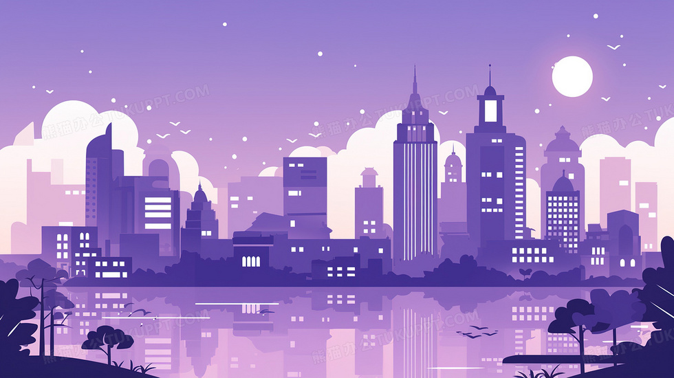 本作品内容为紫色城市建筑剪影远景现代风光建筑插画, 格式为 jpg, 大小2 MB, 图片尺寸为2912 x 1632, 源文件无水印, 欢迎使用熊猫办公。 如认为平台内容涉嫌侵权,可通过邮件:tousu@tukuppt.com提出书面通知,我们将及时处理。