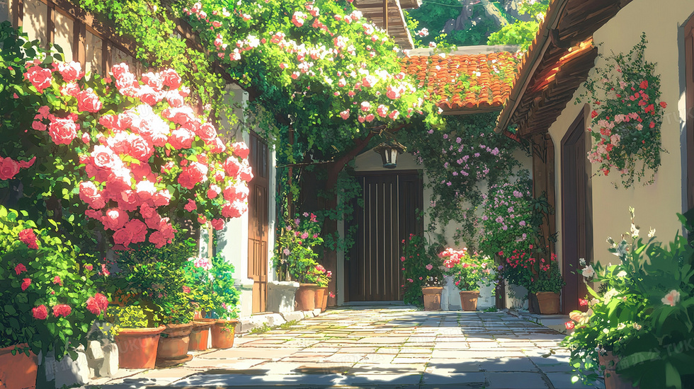 本作品内容为春季春天庭院中盛开的蔷薇花插画, 格式为 jpg, 大小4 MB, 图片尺寸为2912 x 1632, 源文件无水印, 欢迎使用熊猫办公。 如认为平台内容涉嫌侵权,可通过邮件:tousu@tukuppt.com提出书面通知,我们将及时处理。