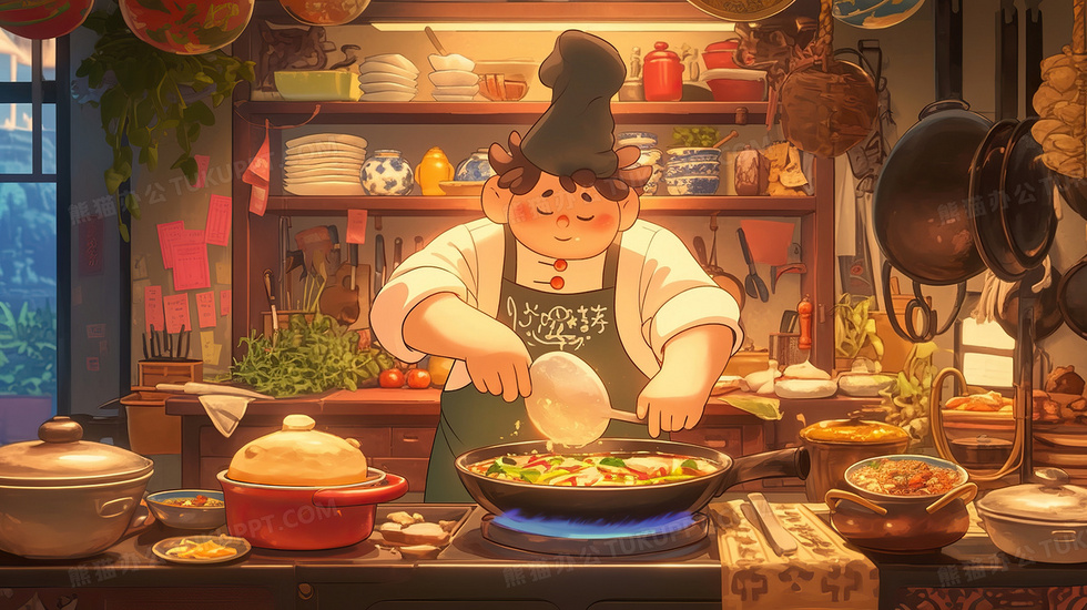 本作品内容为饭店厨师烹饪插画, 格式为 jpg, 大小3 MB, 图片尺寸为2912 x 1632, 源文件无水印, 欢迎使用熊猫办公。 如认为平台内容涉嫌侵权,可通过邮件:tousu@tukuppt.com提出书面通知,我们将及时处理。