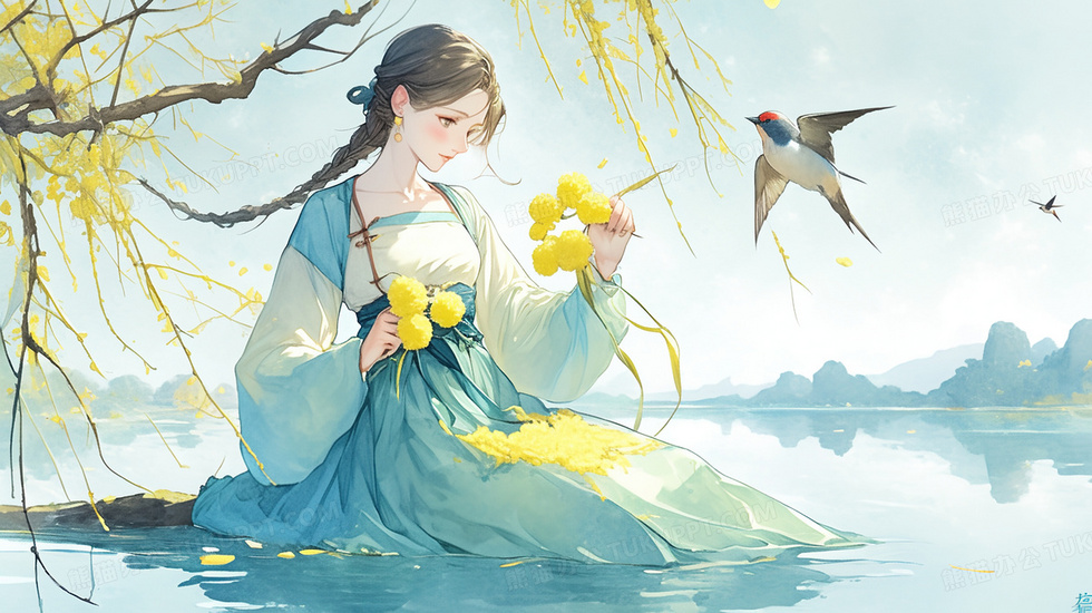本作品内容为春季绿色柳枝飞鸟古风少女插画, 格式为 jpg, 大小3 MB, 图片尺寸为2912 x 1632, 源文件无水印, 欢迎使用熊猫办公。 如认为平台内容涉嫌侵权,可通过邮件:tousu@tukuppt.com提出书面通知,我们将及时处理。