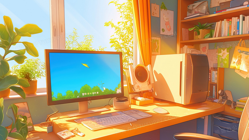 本作品内容为家居装饰一张电脑桌插画, 格式为 jpg, 大小3 MB, 图片尺寸为2912 x 1632, 源文件无水印, 欢迎使用熊猫办公。 如认为平台内容涉嫌侵权,可通过邮件:tousu@tukuppt.com提出书面通知,我们将及时处理。