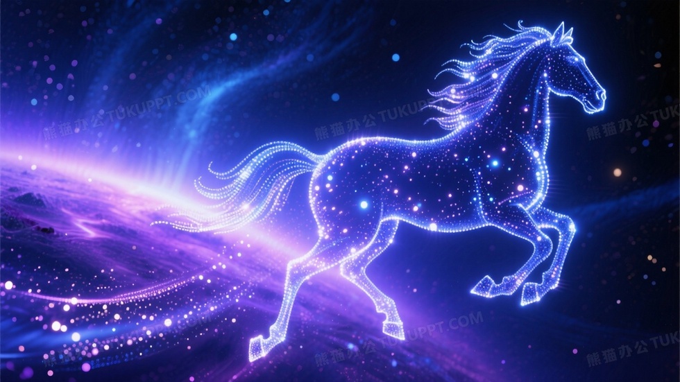 本作品内容为星空粒子光效构成奔腾的骏马轮廓出现在画面一侧, 格式为 jpg, 大小1 MB, 图片尺寸为1664 x 936, 作品中背景图片无需修改, 源文件无水印,可以直接使用, 欢迎使用熊猫办公。 如认为平台内容涉嫌侵权,可通过邮件:tousu@tukuppt.com提出书面通知,我们将及时处理。