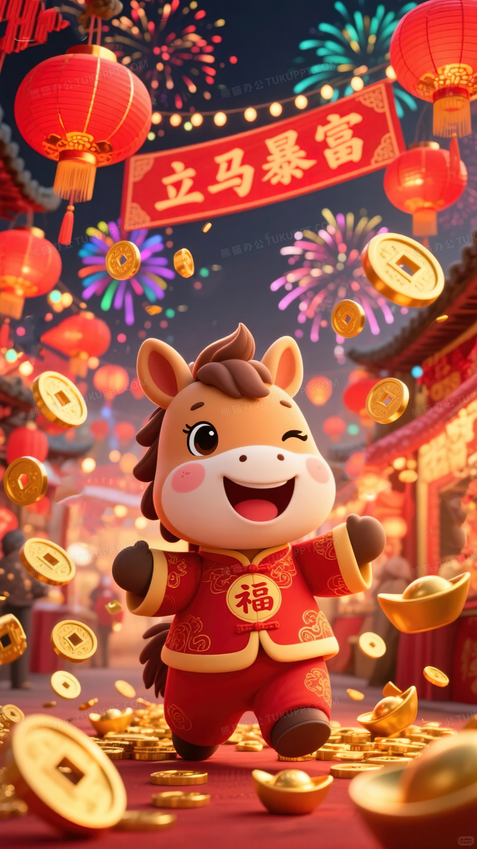 本作品内容为马年新年创意壁纸立马暴富卡通马插画, 格式为 jpg, 大小6 MB, 图片尺寸为1872 x 3328, 源文件无水印, 欢迎使用熊猫办公。 如认为平台内容涉嫌侵权,可通过邮件:tousu@tukuppt.com提出书面通知,我们将及时处理。