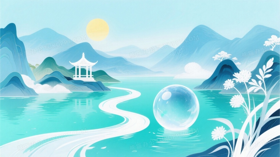 本作品内容为国潮山水画风主体有蓝绿色调的山水, 格式为 jpg, 大小1 MB, 图片尺寸为1664 x 936, 作品中背景图片无需修改, 源文件无水印,可以直接使用, 欢迎使用熊猫办公。 如认为平台内容涉嫌侵权,可通过邮件:tousu@tukuppt.com提出书面通知,我们将及时处理。