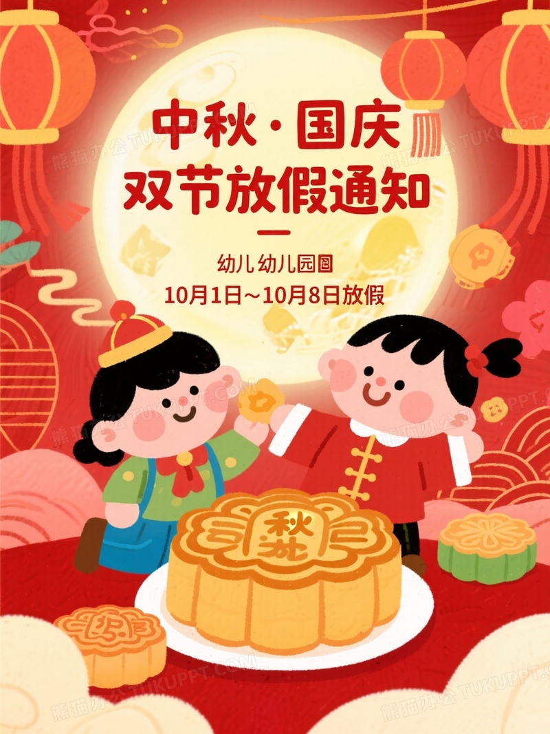 本作品内容为中秋•国庆双节放假通知, 格式为 jpg, 大小1 MB, 图片尺寸为1104 x 1472, 源文件无水印, 欢迎使用熊猫办公。 如认为平台内容涉嫌侵权,可通过邮件:tousu@tukuppt.com提出书面通知,我们将及时处理。