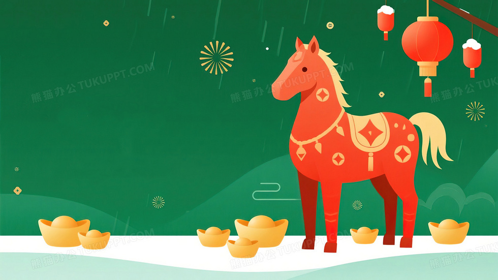 本作品内容为红绿撞色马年创意春节背景, 格式为 jpg, 大小5 MB, 图片尺寸为3328 x 1872, 作品中背景图片无需修改, 源文件无水印,可以直接使用, 欢迎使用熊猫办公。 如认为平台内容涉嫌侵权,可通过邮件:tousu@tukuppt.com提出书面通知,我们将及时处理。