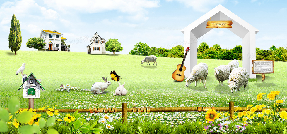 本作品内容为蓝天白云草原树木房子农场兔子锦羊海报banner, 格式为 psd, 图片尺寸为1920 x 900, 作品中背景图片无需修改, 源文件无水印,可以直接使用, 欢迎使用熊猫办公。 如认为平台内容涉嫌侵权,可通过邮件:tousu@tukuppt.com提出书面通知,我们将及时处理。