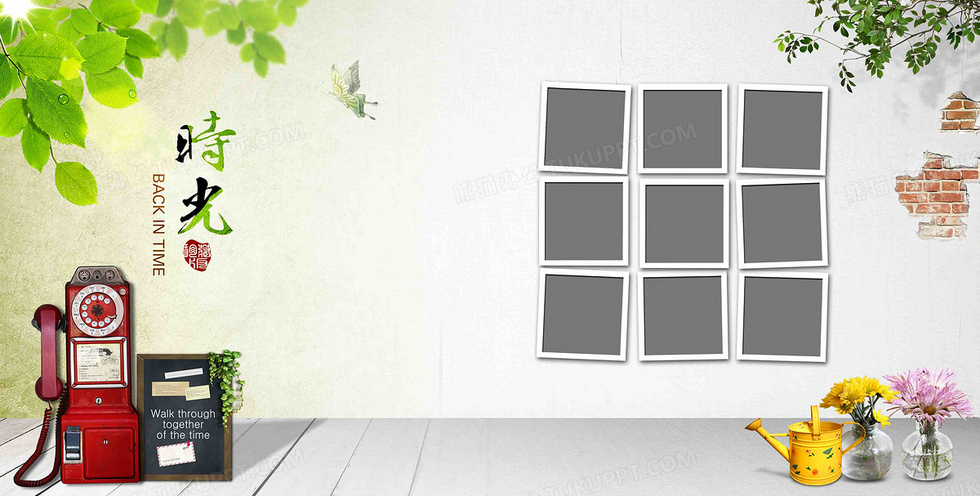本作品内容为怀旧照片墙绿叶草地爬山虎电话时光海报背景, 格式为 psd, 图片尺寸为3953 x 2000, 作品中背景图片无需修改, 源文件无水印,可以直接使用, 欢迎使用熊猫办公。 如认为平台内容涉嫌侵权,可通过邮件:tousu@tukuppt.com提出书面通知,我们将及时处理。