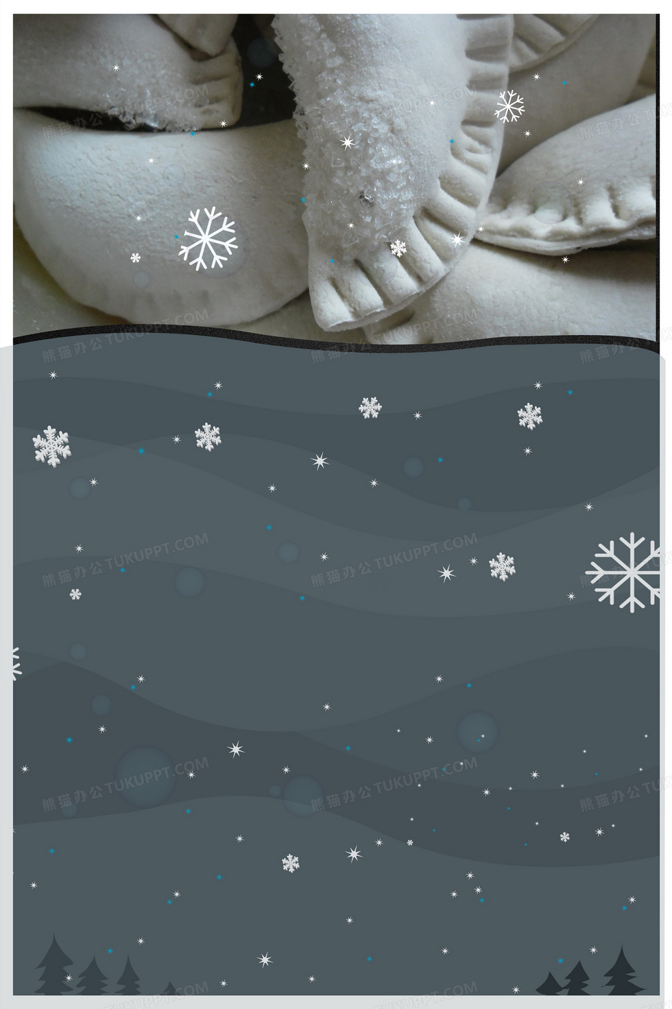 本作品内容为冬至特色传统文化美食饺子海报背景, 格式为 psd, 图片尺寸为3543 x 5315, 作品中背景图片无需修改, 源文件无水印,可以直接使用, 欢迎使用熊猫办公。 如认为平台内容涉嫌侵权,可通过邮件:tousu@tukuppt.com提出书面通知,我们将及时处理。