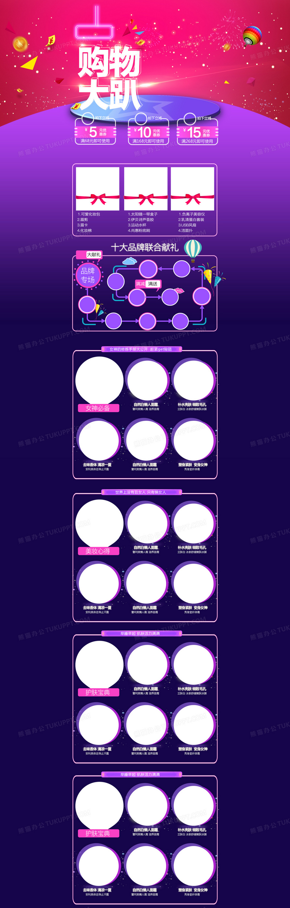 本作品内容为紫色狂欢购物大趴化妆品店铺首页背景, 格式为 psd, 图片尺寸为1920 x 6008, 作品中背景图片无需修改, 源文件无水印,可以直接使用, 欢迎使用熊猫办公。 如认为平台内容涉嫌侵权,可通过邮件:tousu@tukuppt.com提出书面通知,我们将及时处理。