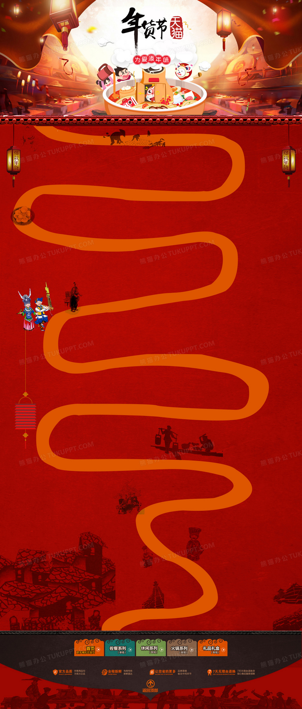 本作品内容为红色卡通天猫年货节食品店铺首页背景, 格式为 psd, 图片尺寸为1920 x 4497, 作品中背景图片无需修改, 源文件无水印,可以直接使用, 欢迎使用熊猫办公。 如认为平台内容涉嫌侵权,可通过邮件:tousu@tukuppt.com提出书面通知,我们将及时处理。