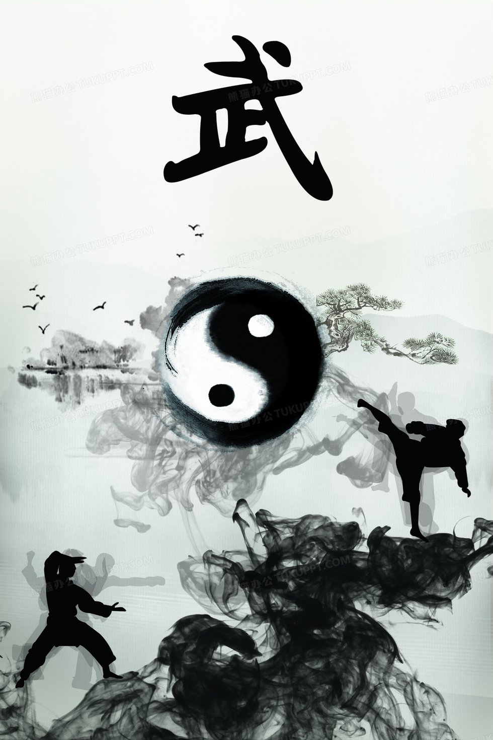 本作品内容为武术水墨宣传海报背景素材, 格式为 psd, 图片尺寸为2362 x 3543, 作品中背景图片无需修改, 源文件无水印,可以直接使用, 欢迎使用熊猫办公。 如认为平台内容涉嫌侵权,可通过邮件:tousu@tukuppt.com提出书面通知,我们将及时处理。