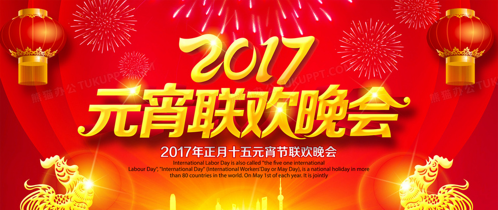 本作品内容为2017元宵联欢晚会狂欢, 格式为 psd, 图片尺寸为1920 x 810, 作品中背景图片无需修改, 源文件无水印,可以直接使用, 欢迎使用熊猫办公。 如认为平台内容涉嫌侵权,可通过邮件:tousu@tukuppt.com提出书面通知,我们将及时处理。