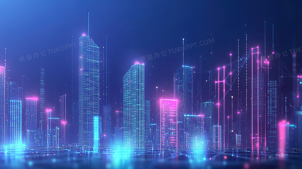本作品内容为数字化未来都市背景, 格式为 jpg, 大小4 MB, 图片尺寸为2912 x 1632, 作品中背景图片无需修改, 源文件无水印,可以直接使用, 欢迎使用熊猫办公。 如认为平台内容涉嫌侵权,可通过邮件:tousu@tukuppt.com提出书面通知,我们将及时处理。
