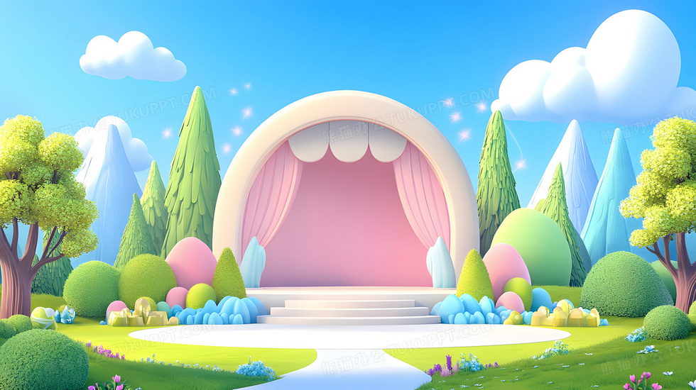 本作品内容为C4D马卡龙风格可爱儿童表演舞台背景, 格式为 jpg, 大小3 MB, 图片尺寸为2912 x 1632, 作品中背景图片无需修改, 源文件无水印,可以直接使用, 欢迎使用熊猫办公。 如认为平台内容涉嫌侵权,可通过邮件:tousu@tukuppt.com提出书面通知,我们将及时处理。