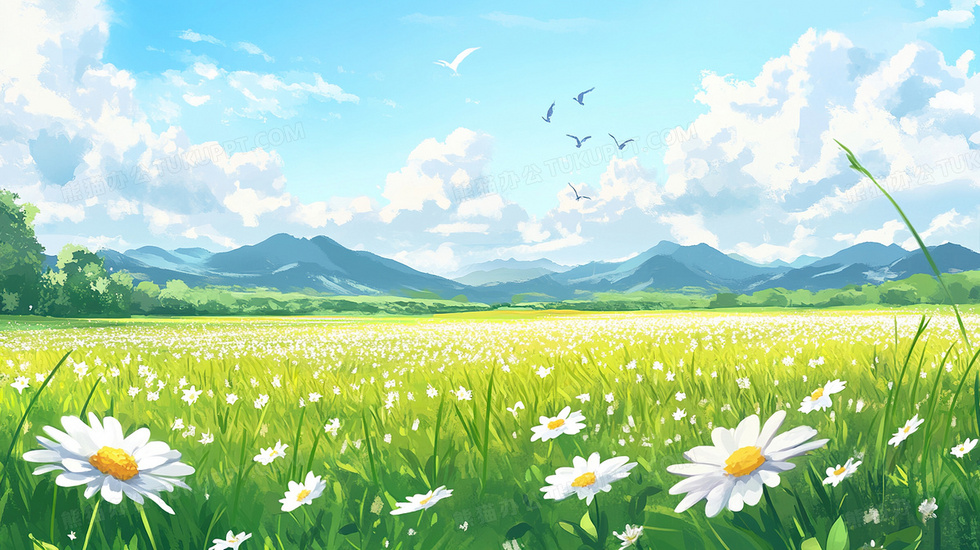 本作品内容为小雏菊草地蓝天春天花朵花卉唯美插画, 格式为 jpg, 大小3 MB, 图片尺寸为2912 x 1632, 源文件无水印, 欢迎使用熊猫办公。 如认为平台内容涉嫌侵权,可通过邮件:tousu@tukuppt.com提出书面通知,我们将及时处理。