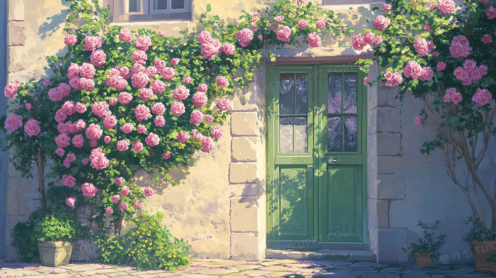 本作品内容为春季春天庭院中盛开的蔷薇花插画, 格式为 jpg, 大小4 MB, 图片尺寸为2912 x 1632, 源文件无水印, 欢迎使用熊猫办公。 如认为平台内容涉嫌侵权,可通过邮件:tousu@tukuppt.com提出书面通知,我们将及时处理。
