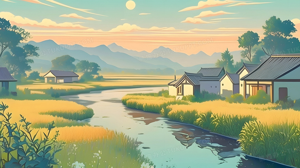 本作品内容为唯美清新河流旁的房子插画, 格式为 jpg, 大小3 MB, 图片尺寸为2912 x 1632, 源文件无水印, 欢迎使用熊猫办公。 如认为平台内容涉嫌侵权,可通过邮件:tousu@tukuppt.com提出书面通知,我们将及时处理。