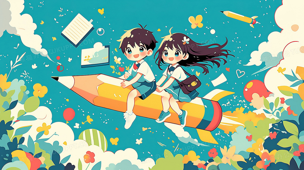本作品内容为卡通女孩男孩铅笔文具天空插画, 格式为 jpg, 大小3 MB, 图片尺寸为2912 x 1632, 源文件无水印, 欢迎使用熊猫办公。 如认为平台内容涉嫌侵权,可通过邮件:tousu@tukuppt.com提出书面通知,我们将及时处理。