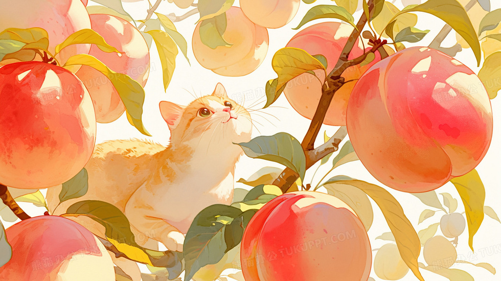 本作品内容为桃树上硕果累累的水果桃子和宠物猫插画, 格式为 jpg, 大小3 MB, 图片尺寸为2912 x 1632, 源文件无水印, 欢迎使用熊猫办公。 如认为平台内容涉嫌侵权,可通过邮件:tousu@tukuppt.com提出书面通知,我们将及时处理。