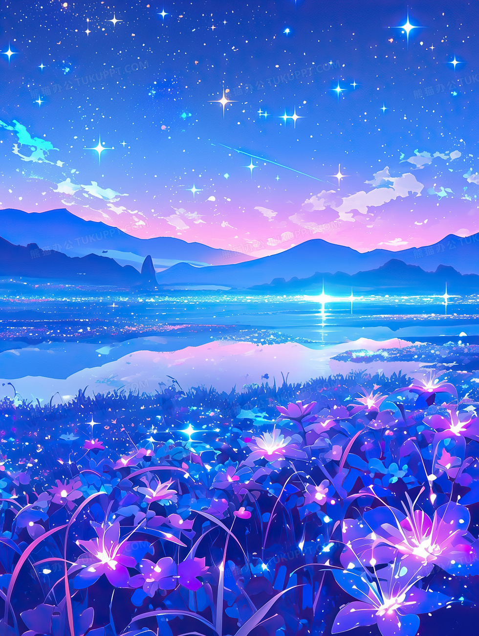 本作品内容为许愿星辰花海唯美风景插画, 格式为 jpg, 大小4 MB, 图片尺寸为1856 x 2464, 源文件无水印, 欢迎使用熊猫办公。 如认为平台内容涉嫌侵权,可通过邮件:tousu@tukuppt.com提出书面通知,我们将及时处理。
