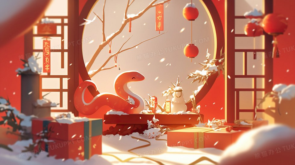 本作品内容为2025蛇年新年礼物插画, 格式为 jpg, 大小2 MB, 图片尺寸为2912 x 1632, 源文件无水印, 欢迎使用熊猫办公。 如认为平台内容涉嫌侵权,可通过邮件:tousu@tukuppt.com提出书面通知,我们将及时处理。
