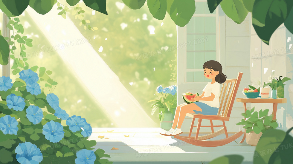本作品内容为盛夏的午后女孩坐在门廊的摇椅上乘凉插画, 格式为 jpg, 大小5 MB, 图片尺寸为2912 x 1632, 源文件无水印, 欢迎使用熊猫办公。 如认为平台内容涉嫌侵权,可通过邮件:tousu@tukuppt.com提出书面通知,我们将及时处理。
