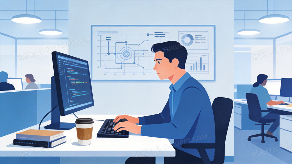 本作品内容为蓝白简约风程序员办公插画, 格式为 jpg, 大小1 MB, 图片尺寸为2560 x 1440, 源文件无水印, 欢迎使用熊猫办公。 如认为平台内容涉嫌侵权,可通过邮件:tousu@tukuppt.com提出书面通知,我们将及时处理。