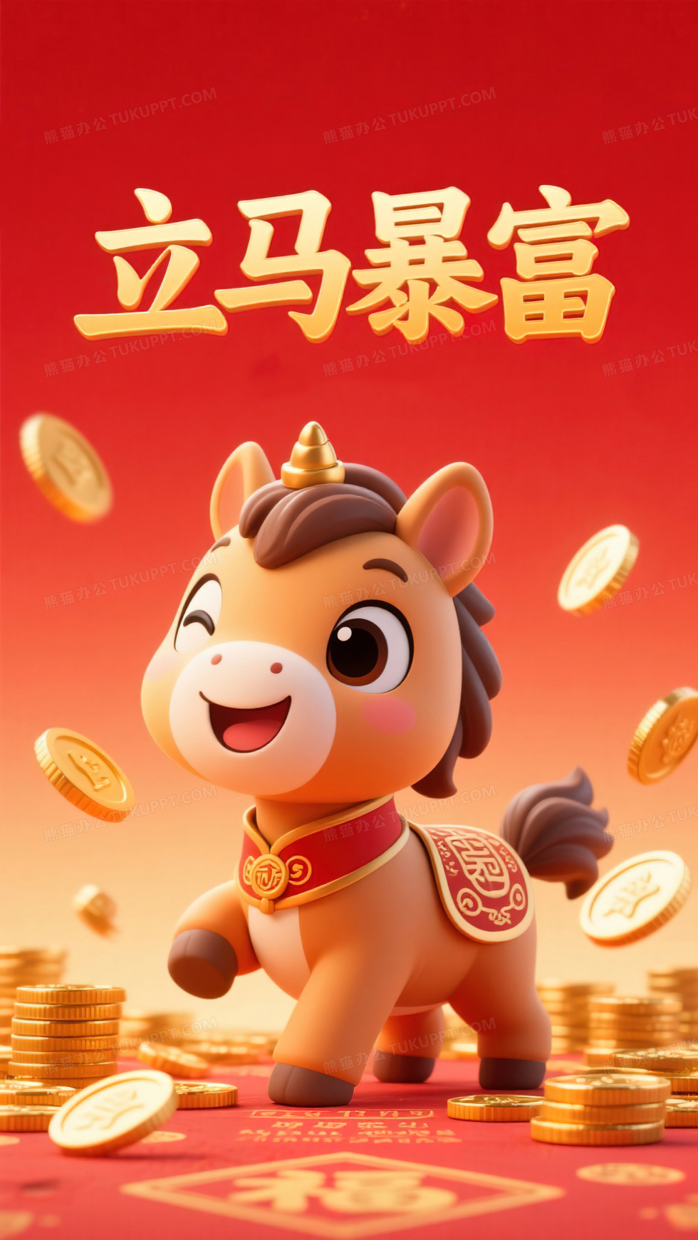 本作品内容为马年新年创意壁纸立马爆富卡通马插画, 格式为 jpg, 大小5 MB, 图片尺寸为1872 x 3328, 源文件无水印, 欢迎使用熊猫办公。 如认为平台内容涉嫌侵权,可通过邮件:tousu@tukuppt.com提出书面通知,我们将及时处理。