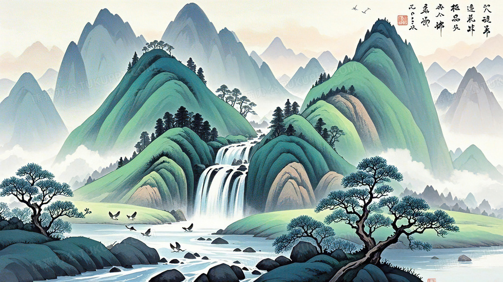 本作品内容为中国风水墨风山水插画, 格式为 jpg, 大小6 MB, 图片尺寸为3072 x 1728, 源文件无水印, 欢迎使用熊猫办公。 如认为平台内容涉嫌侵权,可通过邮件:tousu@tukuppt.com提出书面通知,我们将及时处理。