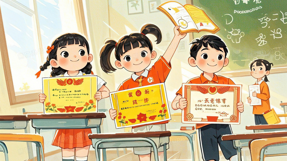 本作品内容为小学生拿奖状荣誉获奖表彰插画, 格式为 jpg, 大小5 MB, 图片尺寸为3072 x 1728, 源文件无水印, 欢迎使用熊猫办公。 如认为平台内容涉嫌侵权,可通过邮件:tousu@tukuppt.com提出书面通知,我们将及时处理。