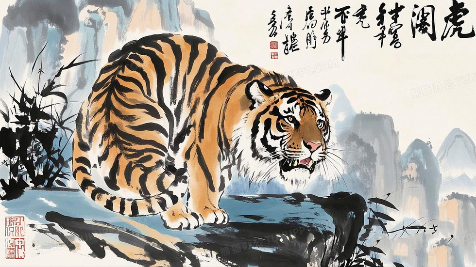本作品内容为中国水墨风老虎场景插画, 格式为 jpg, 大小3 MB, 图片尺寸为2720 x 1530, 源文件无水印, 欢迎使用熊猫办公。 如认为平台内容涉嫌侵权,可通过邮件:tousu@tukuppt.com提出书面通知,我们将及时处理。