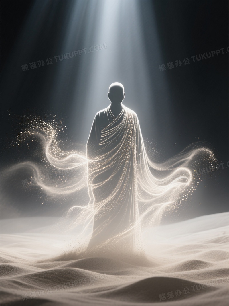 本作品内容为用极细沙化粒子绘制一个僧人轮廓, 格式为 jpg, 大小1 MB, 图片尺寸为1104 x 1472, 源文件无水印, 欢迎使用熊猫办公。 如认为平台内容涉嫌侵权,可通过邮件:tousu@tukuppt.com提出书面通知,我们将及时处理。