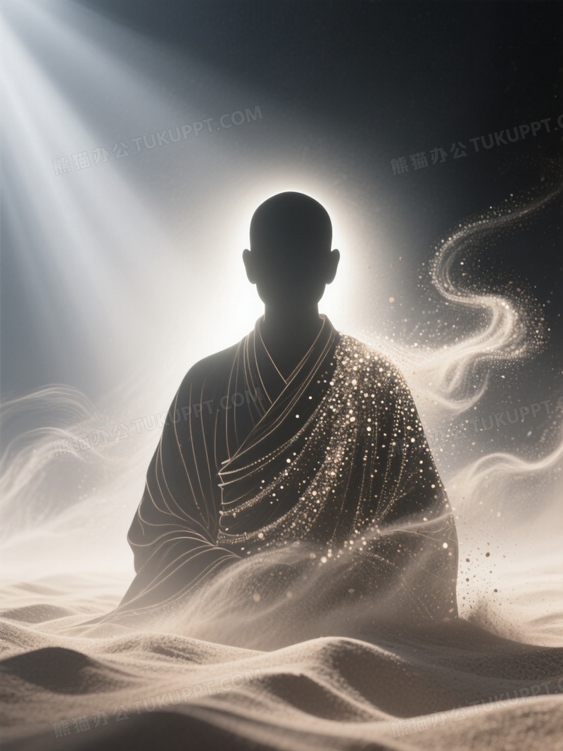 本作品内容为用极细沙化粒子绘制一个僧人轮廓, 格式为 jpg, 大小1 MB, 图片尺寸为1104 x 1472, 源文件无水印, 欢迎使用熊猫办公。 如认为平台内容涉嫌侵权,可通过邮件:tousu@tukuppt.com提出书面通知,我们将及时处理。