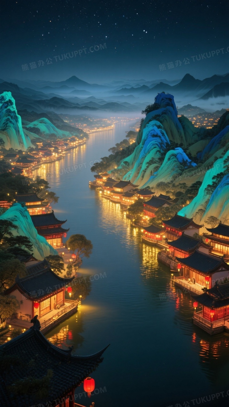 本作品内容为灯火通明的北宋千里江山图全景, 格式为 jpg, 大小1 MB, 图片尺寸为936 x 1664, 源文件无水印, 欢迎使用熊猫办公。 如认为平台内容涉嫌侵权,可通过邮件:tousu@tukuppt.com提出书面通知,我们将及时处理。