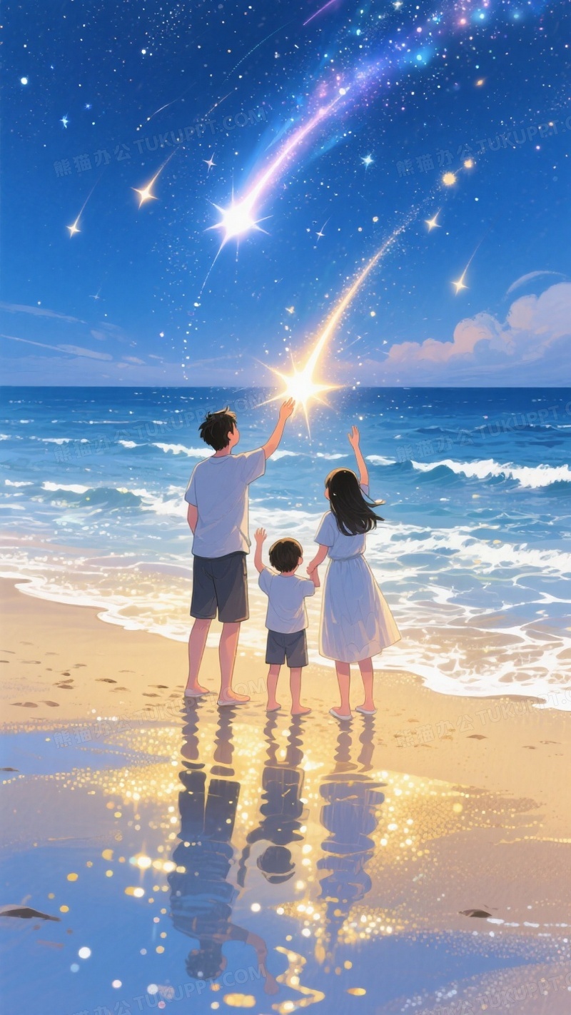 本作品内容为精美梦幻插画一家三口在海边对着流星雨许愿, 格式为 jpg, 大小1 MB, 图片尺寸为936 x 1664, 源文件无水印, 欢迎使用熊猫办公。 如认为平台内容涉嫌侵权,可通过邮件:tousu@tukuppt.com提出书面通知,我们将及时处理。