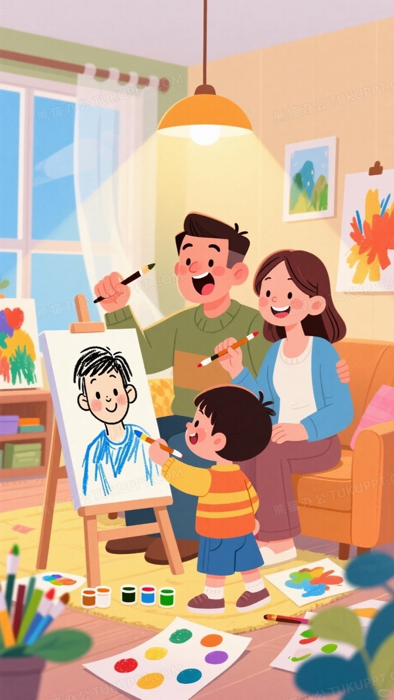本作品内容为活泼卡通亲子插画客厅中小朋友拿着画笔给爸爸妈妈画肖像, 格式为 jpg, 大小1 MB, 图片尺寸为936 x 1664, 源文件无水印, 欢迎使用熊猫办公。 如认为平台内容涉嫌侵权,可通过邮件:tousu@tukuppt.com提出书面通知,我们将及时处理。