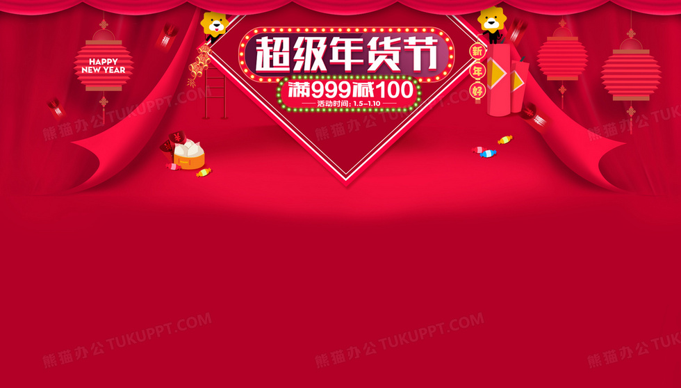 本作品内容为红色狂欢超级年货节店铺首页背景, 格式为 psd, 图片尺寸为1920 x 1092, 作品中背景图片无需修改, 源文件无水印,可以直接使用, 欢迎使用熊猫办公。 如认为平台内容涉嫌侵权,可通过邮件:tousu@tukuppt.com提出书面通知,我们将及时处理。
