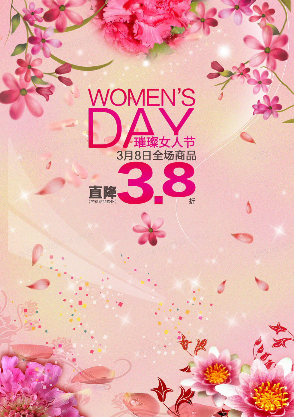 本作品内容为花卉三八妇女节海报背景素材, 格式为 psd, 图片尺寸为2480 x 3508, 作品中背景图片无需修改, 源文件无水印,可以直接使用, 欢迎使用熊猫办公。 如认为平台内容涉嫌侵权,可通过邮件:tousu@tukuppt.com提出书面通知,我们将及时处理。