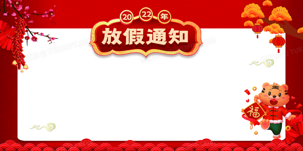 本作品内容为喜庆虎年春节放假通知背景, 格式为 psd, 大小57 MB, 图片尺寸为4724 x 2362, 作品中背景图片无需修改, 源文件无水印,可以直接使用, 欢迎使用熊猫办公。 如认为平台内容涉嫌侵权,可通过邮件:tousu@tukuppt.com提出书面通知,我们将及时处理。